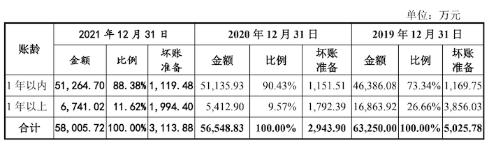 由于报告期内公司六成以上收入集中于第四季度,国铁科技每年应收账款净额分别为5.85亿元、5.38亿元和5.49亿元,占营业收入的比重分别为84.91%、67.17%、62.96%,比重较高。截至2021年,公司1年以上应收账款余额6741.02万元,比例超10%,不断上升。