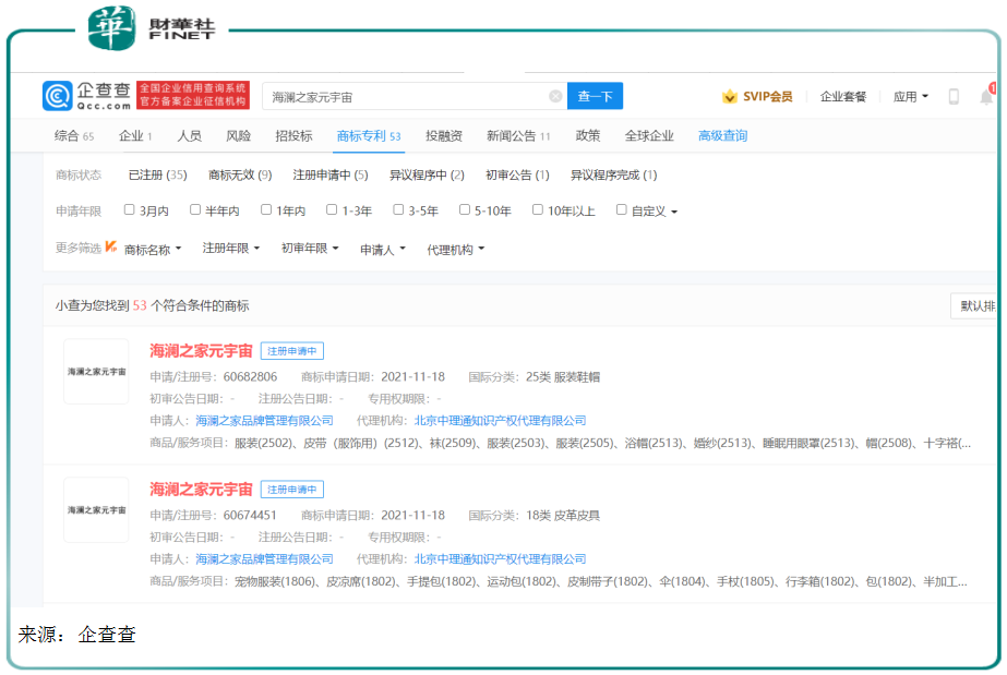 据企查查显示,目前这两个商品依然处于注册申请中。