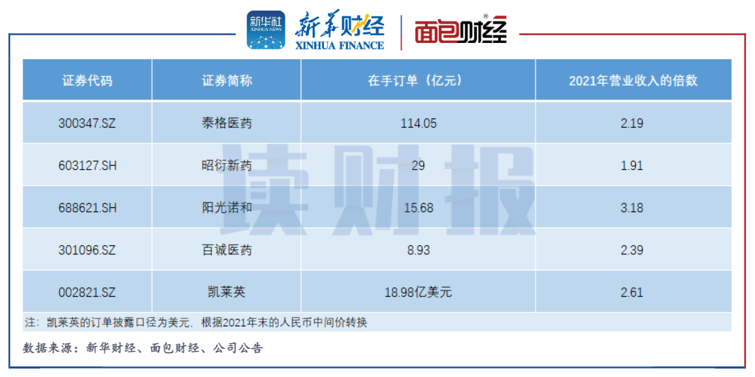部分医疗研发外包企业在最新年报中披露了在手订单情况。相较2021年的营业收入,这些企业在手订单的金额均接近或者超过前者的2倍,一定程度上保证了中短期业绩增长的持续性。