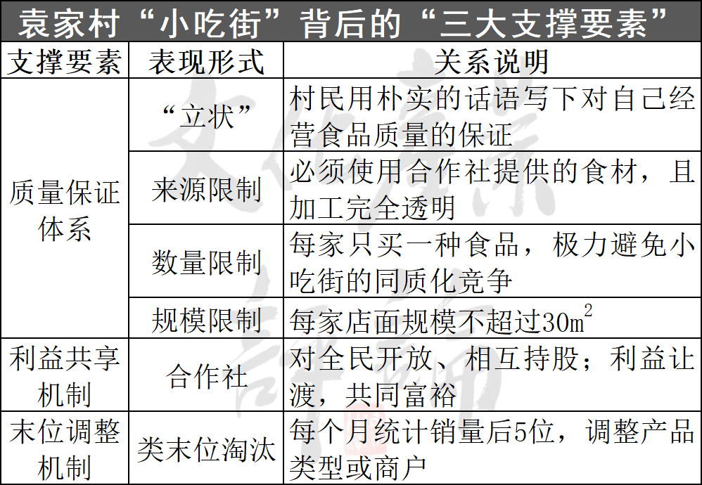 例如整条小吃街就是一个合作社。而在同一条街上,麻花、粉条成了“网红小吃”,但有的小吃经营惨淡,原因可能不在于商户的经营能力不行,而是产品本身不够吸引人,而其产品对于整个关中民俗而言又是不可或缺的一部分,这时候合作社会对这一部分商户进行补贴,以使其获得相对理想的收入,让其安心在此地经营。同时,由于这部分商户对经营的好的商户也有股份,也可享受其盈利的红利,这就不会让村民“争红了眼”,如何协调好村民的利益关系是袁家村繁荣的背后更为精彩的一幕。