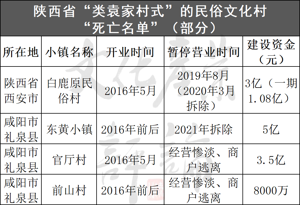 以耗资5亿元打造的东黄小镇为例,据称其“小吃街”的建筑风格、经营内容不仅和“袁家村”小吃街十分相似,甚至连商铺分布都一样:“酸奶挨着醪糟、醪糟挨着辣子...”从这些“细节”不难看出,东黄小镇确实对袁家村进行了细致的“调研与学习”,但仅仅流于表面而不顾自身的实际情况。这些打着“民俗文化”旗号的村内没有民俗、没有文化,只有同质的小吃和仿古建筑,如今已经全部处于停业或拆除的状态——留下的是喧闹后的沉寂、凋敝的牌坊与漠然的村民。