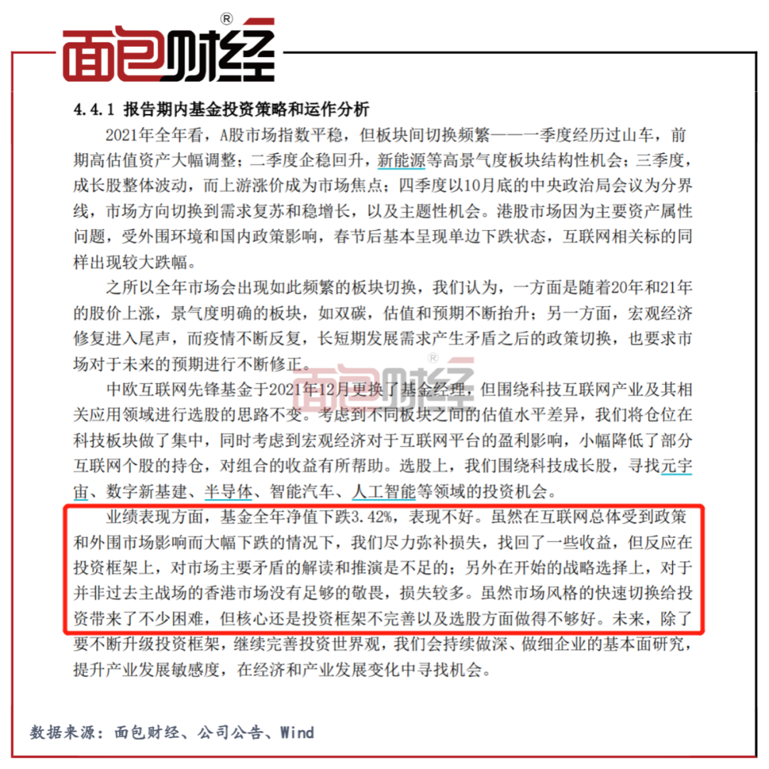 实际上,在中欧互联网先锋2021年年报中,基金管理人也将全年业绩下滑归咎于其资产配置上的不足。