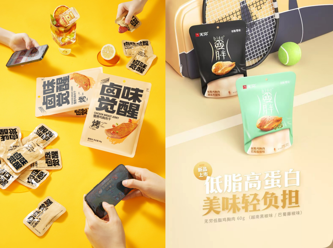 除了控制糖分摄入,高蛋白的零食也是一个不错的选择。被运动人群们又爱又恨的鸡胸肉,就被食品品牌们盯上做成了零食。如无穷食品的嫑胖低脂鸡胸肉和卤味觉醒的慢烤鸡胸肉干,分别采用先蒸后烘和先卤后烤的工艺,让寡淡无味的鸡胸肉变得劲道耐嚼,成为既有肉香又有饱腹感,令人满足的健康零食选择。