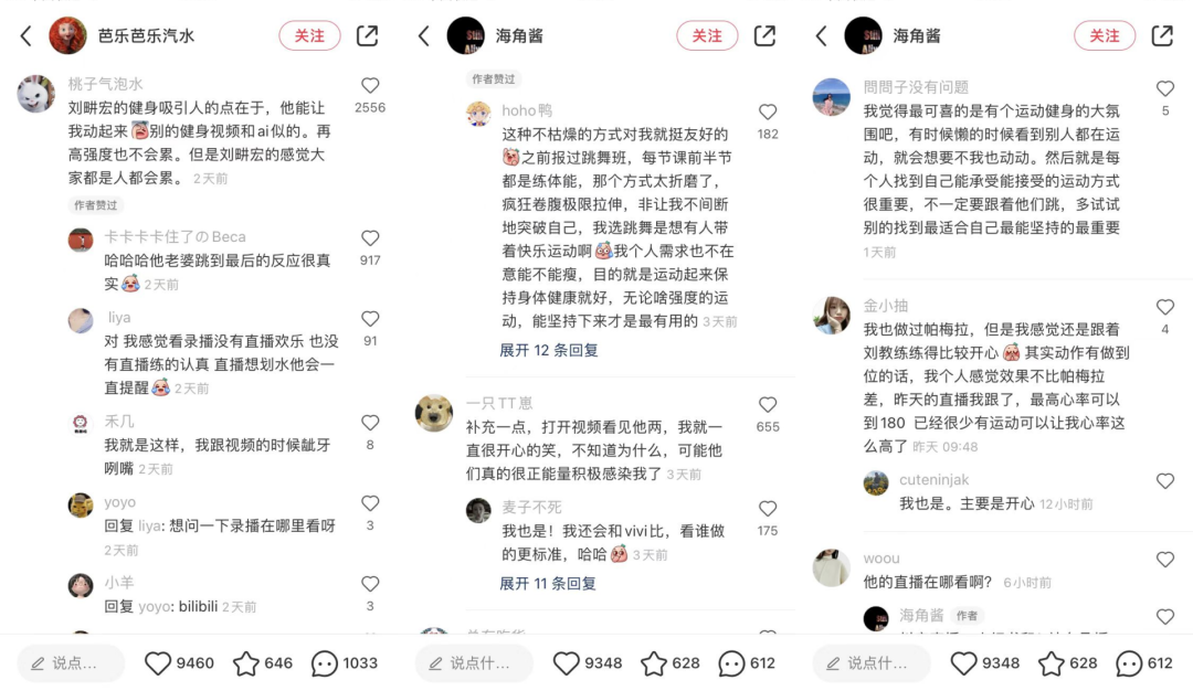 而让吃瓜群众们完成“刘畊宏女孩/男孩”的身份转变,心甘情愿地留在直播间里的另一个原因,是因为大家觉得这是一个让人快乐的直播间,这也是他最独特的“软实力”。 从一些刘畊宏女孩/男孩们的反馈中Foodaily观察到,刘畊宏直播间之所以让她们沉迷是因为直播间的氛围”能让人动起来““真的让人很容易坚持”“感觉时间很快就过去了”。