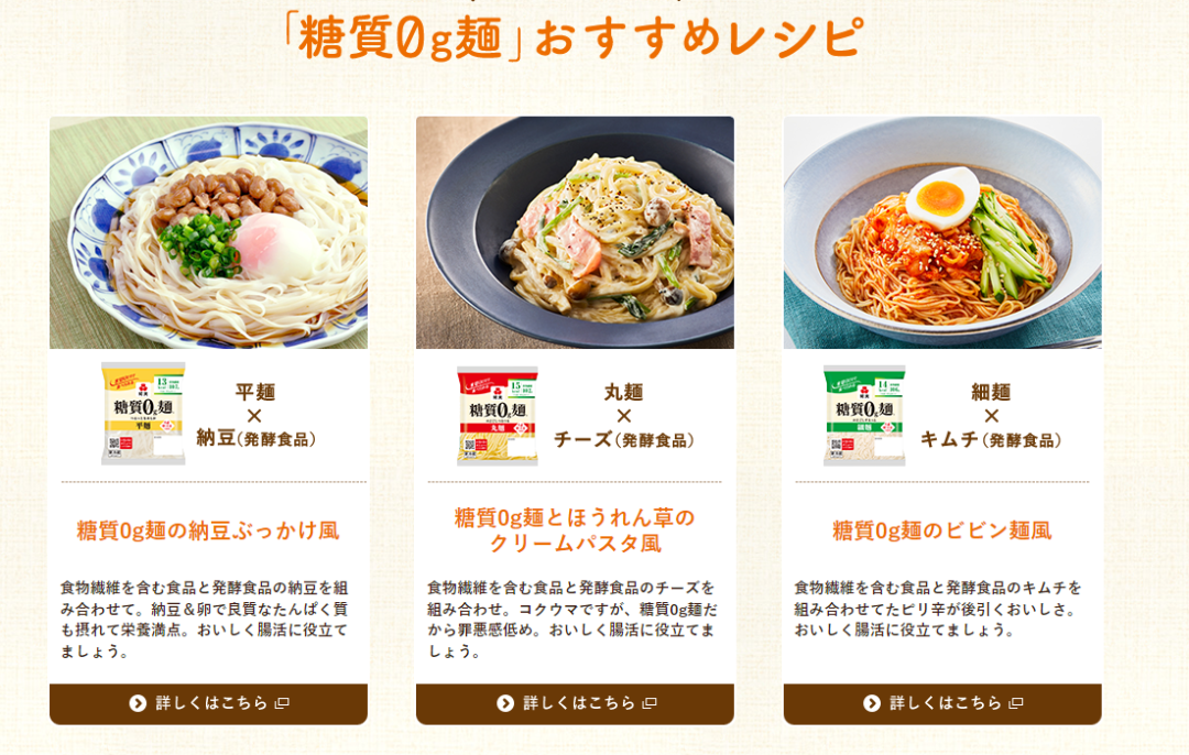 这款零糖质面有细面、圆面、扁面三种形态选择,官网上也介绍了很多使用了这款产品的食谱,提供了丰富的烹饪方案建议,让控碳水餐也能吃得开心。