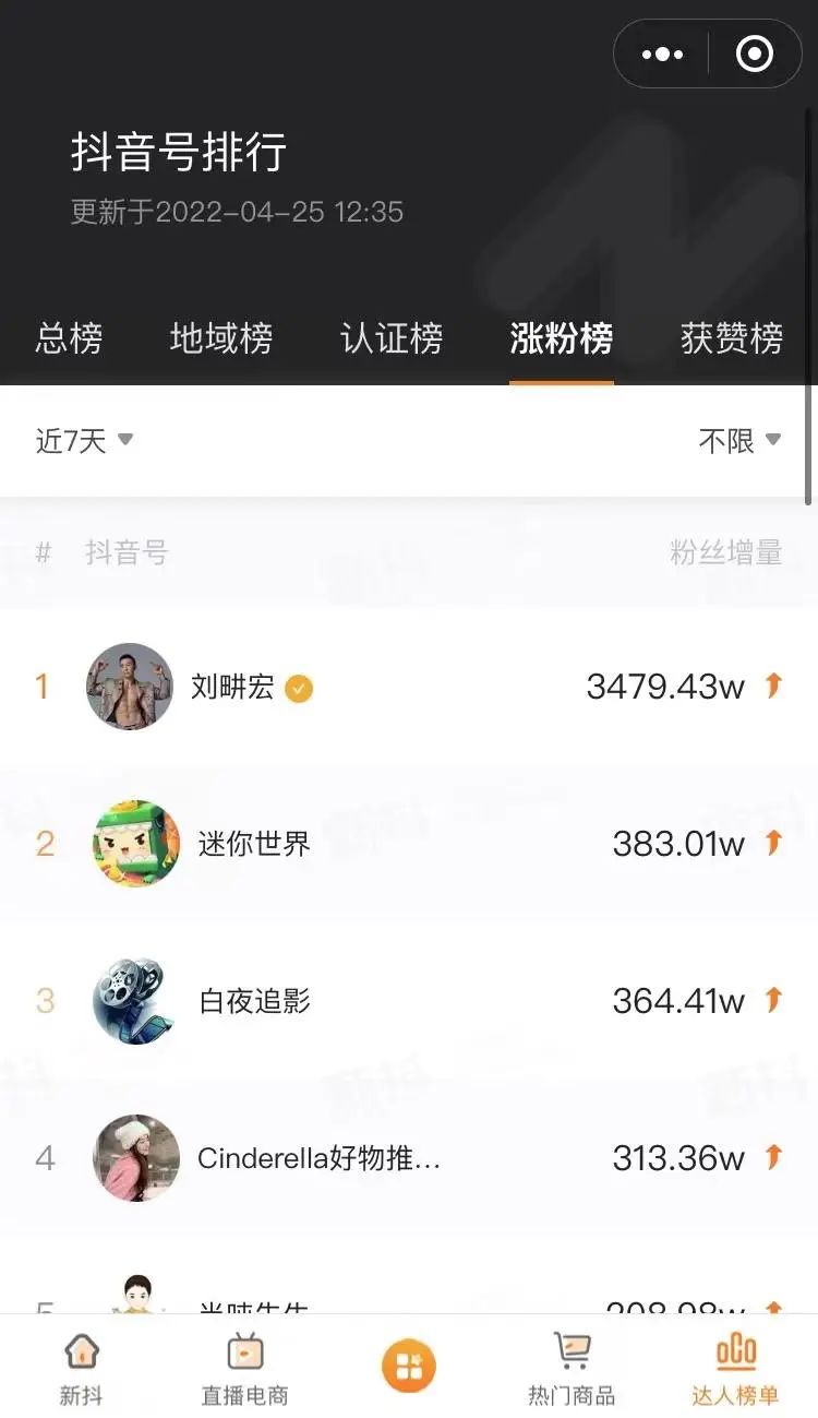 截至4月25号,根据新科数据的涨粉榜数据,刘畊宏近7日粉丝增量为3479.43w,高居榜单第一。
