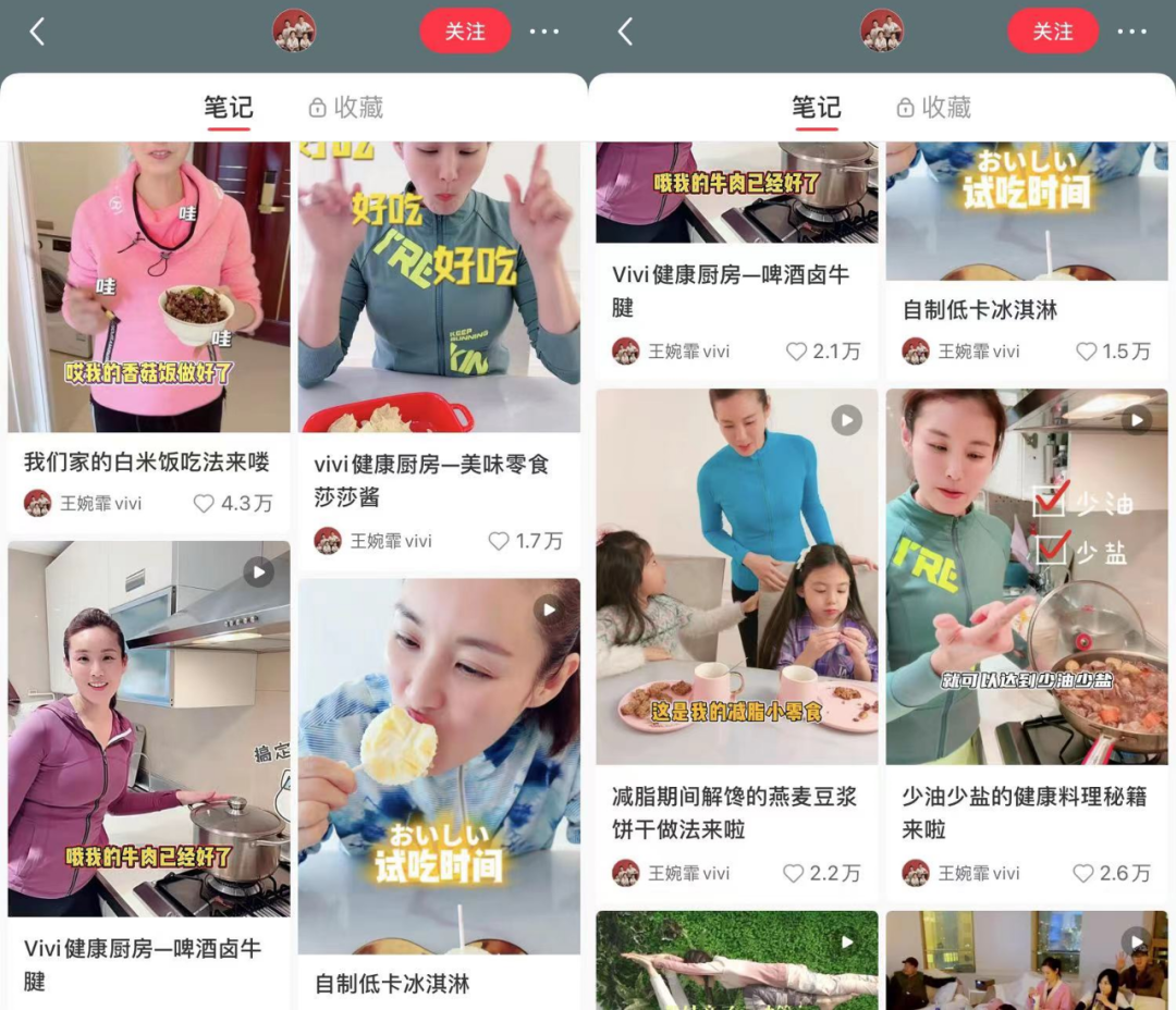 俗话说三分练七分吃,在刘畊宏在自己的账号中分享运动健身内容的同时,王婉霏则开始在自己的小红书账号上分享起了“vivi健康厨房”系列,介绍一些少油少盐、低卡美味的健康料理及轻食。