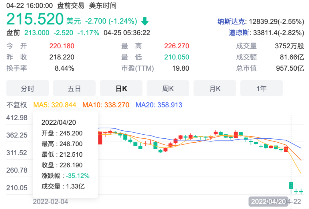 在美股科技股估值整体回调的大背景下,这样一份并不光鲜的财报显然很难再获得华尔街的青睐。财报发布后次日,Netflix股价大跌35%,500亿市值蒸发殆尽,股价也创5年多以来新低。