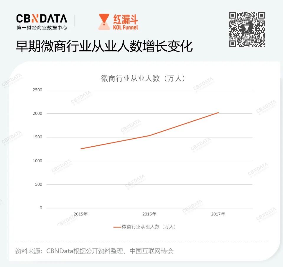 在2015年左右,随着微信日活用户破亿,微信渠道为商家展现出了流量成本低、传播互动强、社交链路广等优势,在这一时期加入微商阵营的从业者也迅速增加。