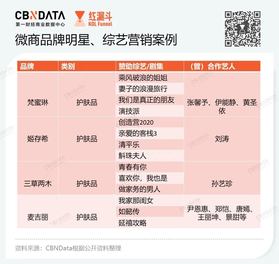 根据CBNData统计,2016年至今,梵蜜琳、姬存希、麦吉丽、三草两木等微商品牌先后凭借巨额投入拿下综艺节目的独家冠名或特约赞助席位。