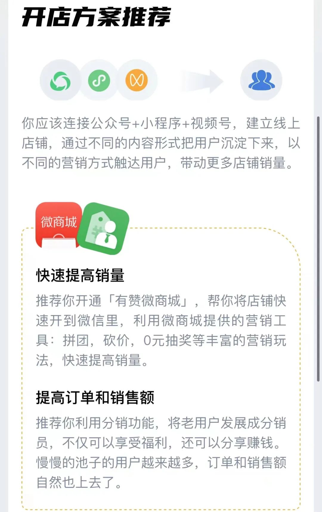 此外,微店、有赞、微盟等移动式网店工具也为微商提供了客户关系管理、整合营销模式等方面的合规玩法。以有赞为例,其公司业务主要包括订阅解决方案与商家解决方案两部分。其中,订阅解决方案中的有赞微商城能够帮助商家搭建可通过多个社交媒体访问的店铺,并商家提供了约100个营销获客工具,如多人拼团、限时折扣、砍价、社群接龙等,并且还有客户资源管理、数据分析等功能。根据有赞的最新财报数据,2021年有赞主要收入是SaaS服务订阅费达到9.7亿元。