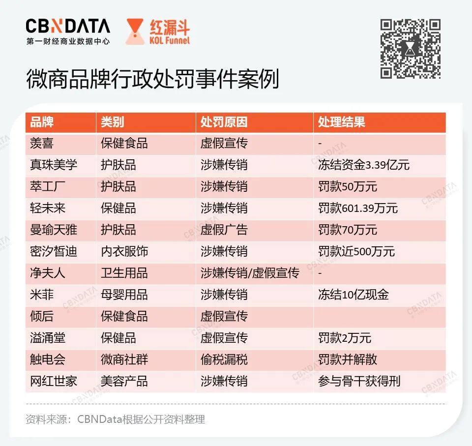 CBNData统计发现,自2019年以来,涉及行政处罚的个人/团队微商品牌中,护肤品和保健品为处罚重灾区。