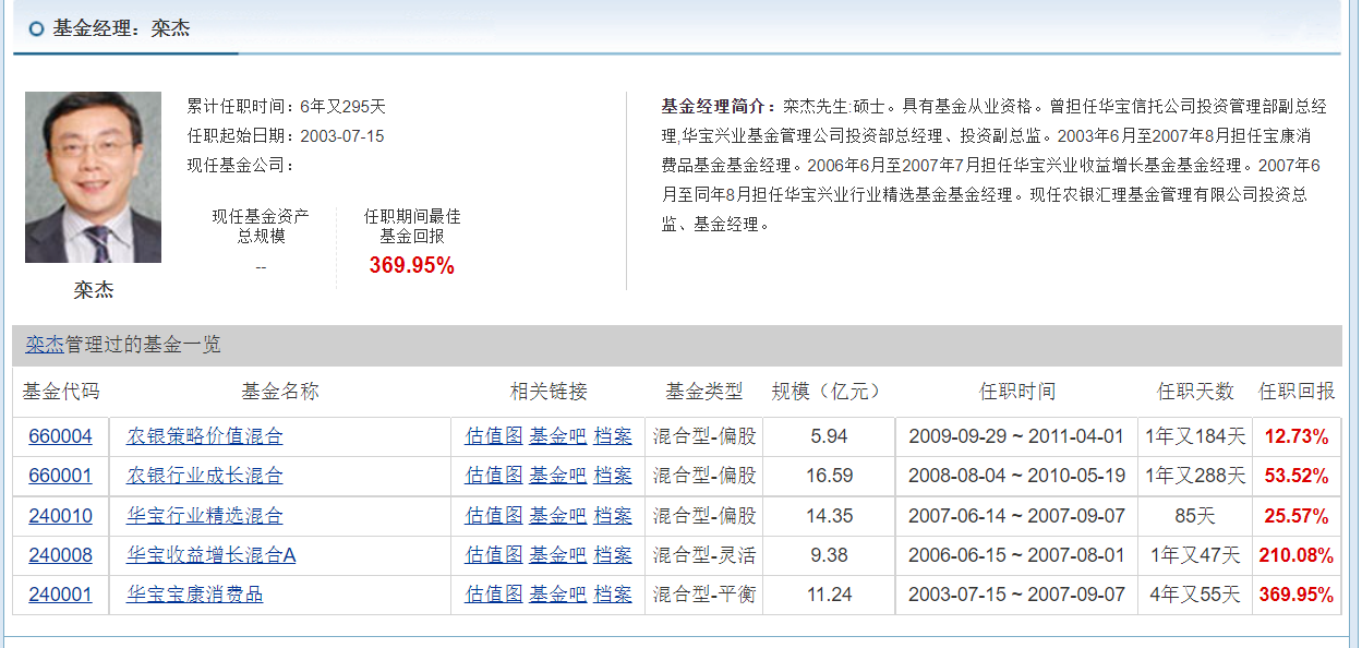 这家媒体称,“栾杰在长达7年的基金从业经历中业绩十分优秀。” 这一点,从天天基金网的公开数据上,也可以清楚看到。由栾杰管理的华宝兴业消费品、华宝兴业收益和农银汇理行业成长基金,在他任职期间的收益率分别达到377%、221%和53%,远远高于同类基金的平均回报率。