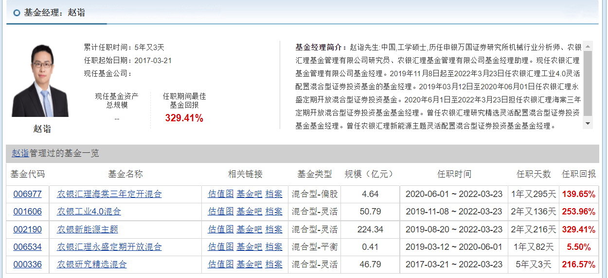 幸运的是,赵诣赶上了赛道股的花样年华。5年任职期间,他最成功的的代表作就是农银新能源主题,回报率高达329.41%,除了农银汇理永盛定期开放混合投资收益5.5%,其他三款基金的总回报都在100-300%之间。