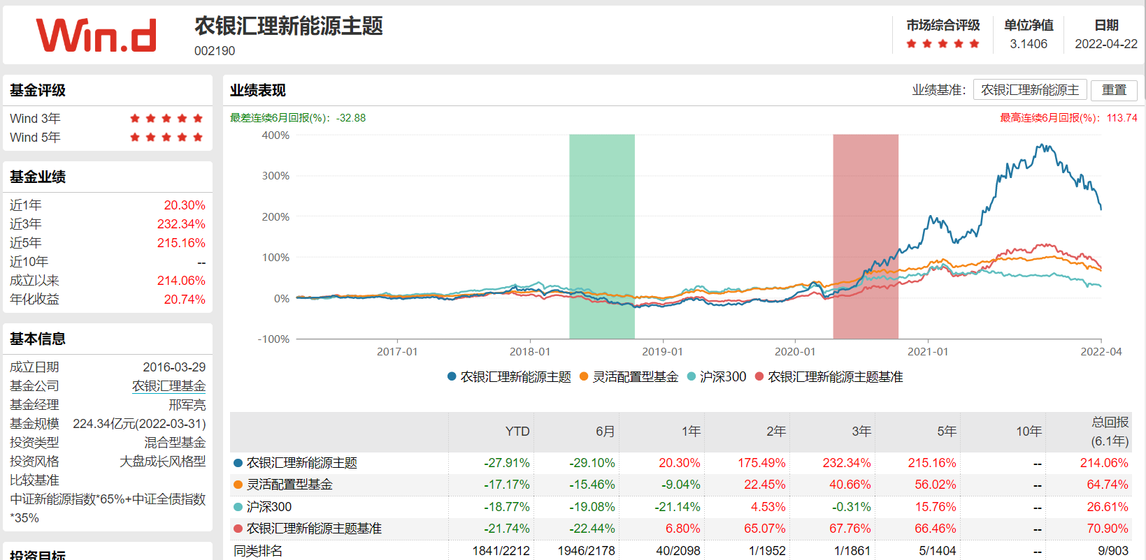 仔细想来,这样说也不为错。毕竟,在依靠赛道股登顶公募基金排行榜后,随着新能源等热门板块退烧,赵诣管理的多只基金的净值也开始回撤。以其最成功的的农银汇理新能源主题基金为例,截至2021年年末,其第一重仓股乃宁德时代,而这只热门股进入2022年后股价出现大幅下跌,截至4月25日收盘,年内跌幅高达33.66%。