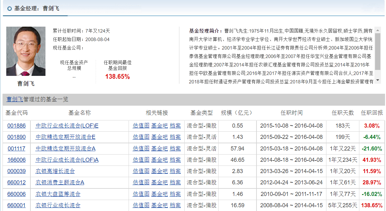 公开信息显示,农银汇理行业成长于2008年8月4日成立,到曹剑飞离任近6年间,这只基金取得139.2%的收益率,高居偏股基金第一名。应该说,这只基金,虽然由栾杰打下了良好的基础,但是在曹剑飞手上大放异彩的。