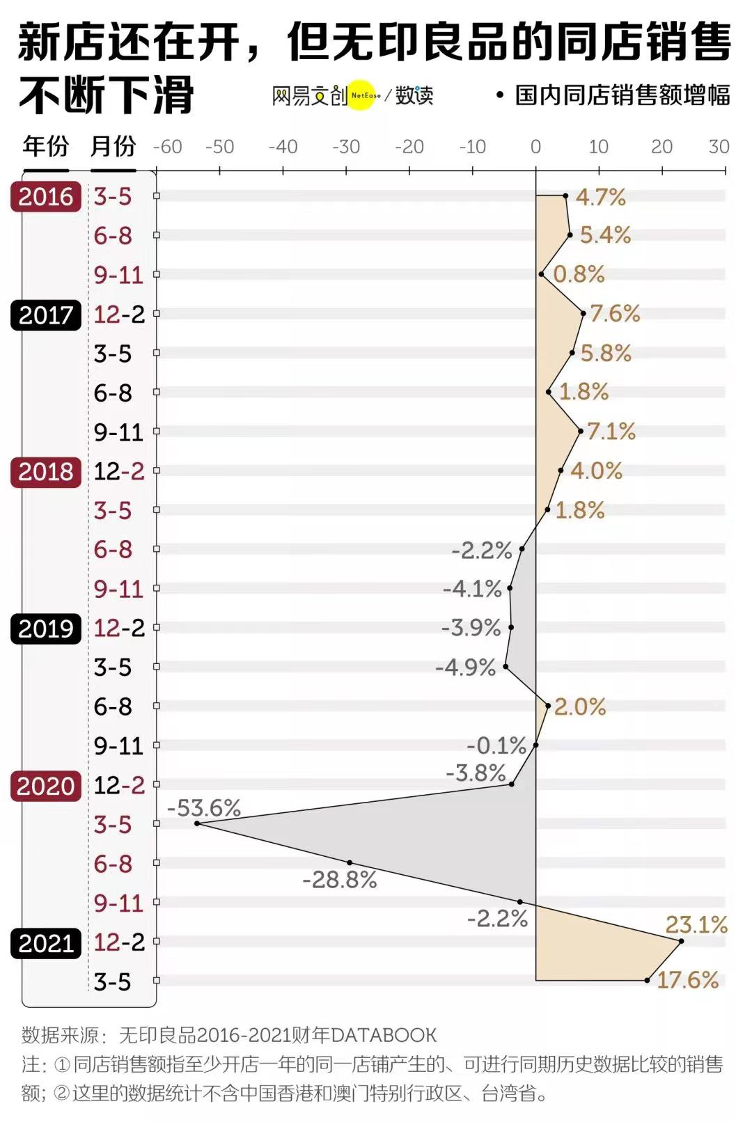 从2018年开始,尽管无印良品仍在拓店,但它在中国的同店销售不断走低,甚至出现负增长,即便忽略疫情最严重的2020年半年,销售额降幅也最大达到4.9%,