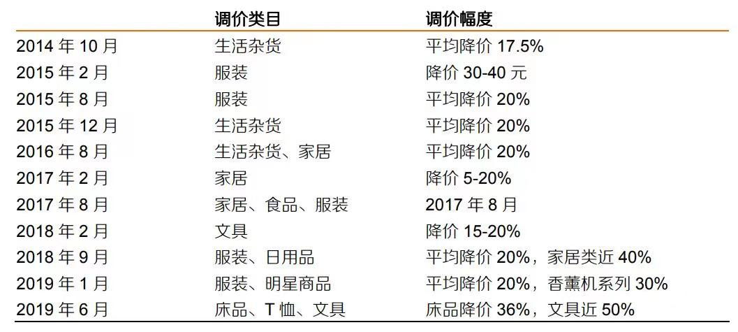 对此,这些年无印良品做了很多努力。首当其冲的是从2014年至今,无印良品连续十多次对商品进行降价,品类覆盖收纳、家居、电子、健康等等,其中不乏爆款产品,降价幅度也一般在10%-220%,部分商品最高降幅甚至达到50%。