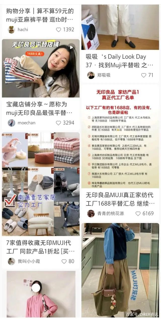 而且不仅是日用杂货零售赛道的玩家在抢夺无印良品的市场,各种MUJI风工厂货也成为诸多消费者的替代选项。无印良品的“平替”、“同源”在小红书和抖音上愈加泛滥,1688代工厂成为最大的赢家。