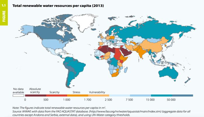 下面的这张地图来自于2015年联合国发布的《世界水发展报告》,这幅图现实了世界上每个国家的人均水资源占有量。2013年,包括沙特和约旦等地区大国在内的一些国家正面临严重的水缺乏危机。