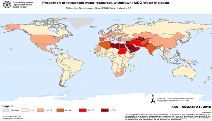 下面的这张地图来自于2016年联合国《世界水发展报告》,图中显示了世界上已经用尽的可再生水资源所占比例。中东和中亚再次位列严重缺水区域,而这些地区的大部分国家已经用尽了本国60%的水资源。