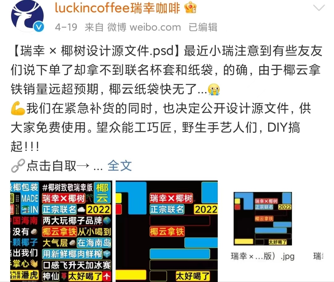 随后,瑞幸做了一件很讨巧的事:公布物料源文件,让网友下载“拿去用”,不增加新成本的情况下,再一次推动用户传播。