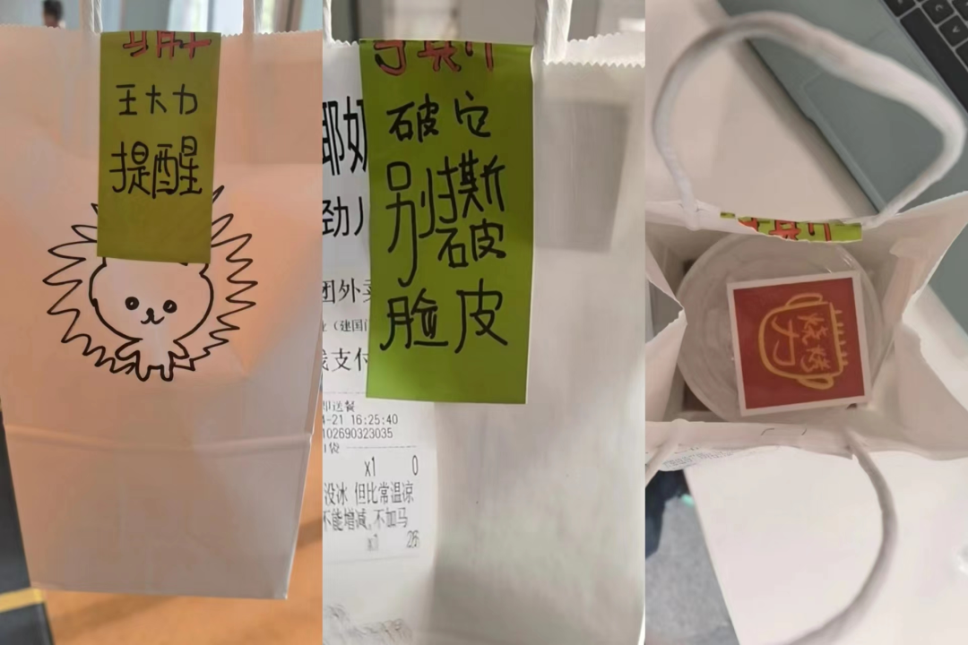 外卖拿到手,也让人印象深刻。外包装上不仅有亲笔画,密封纸还写着“王大力提醒:撕破它别撕破脸皮”;产品的杯身上也贴着一张大大的贴纸,上面写着“王大力提醒,收到后6小时喝完”。