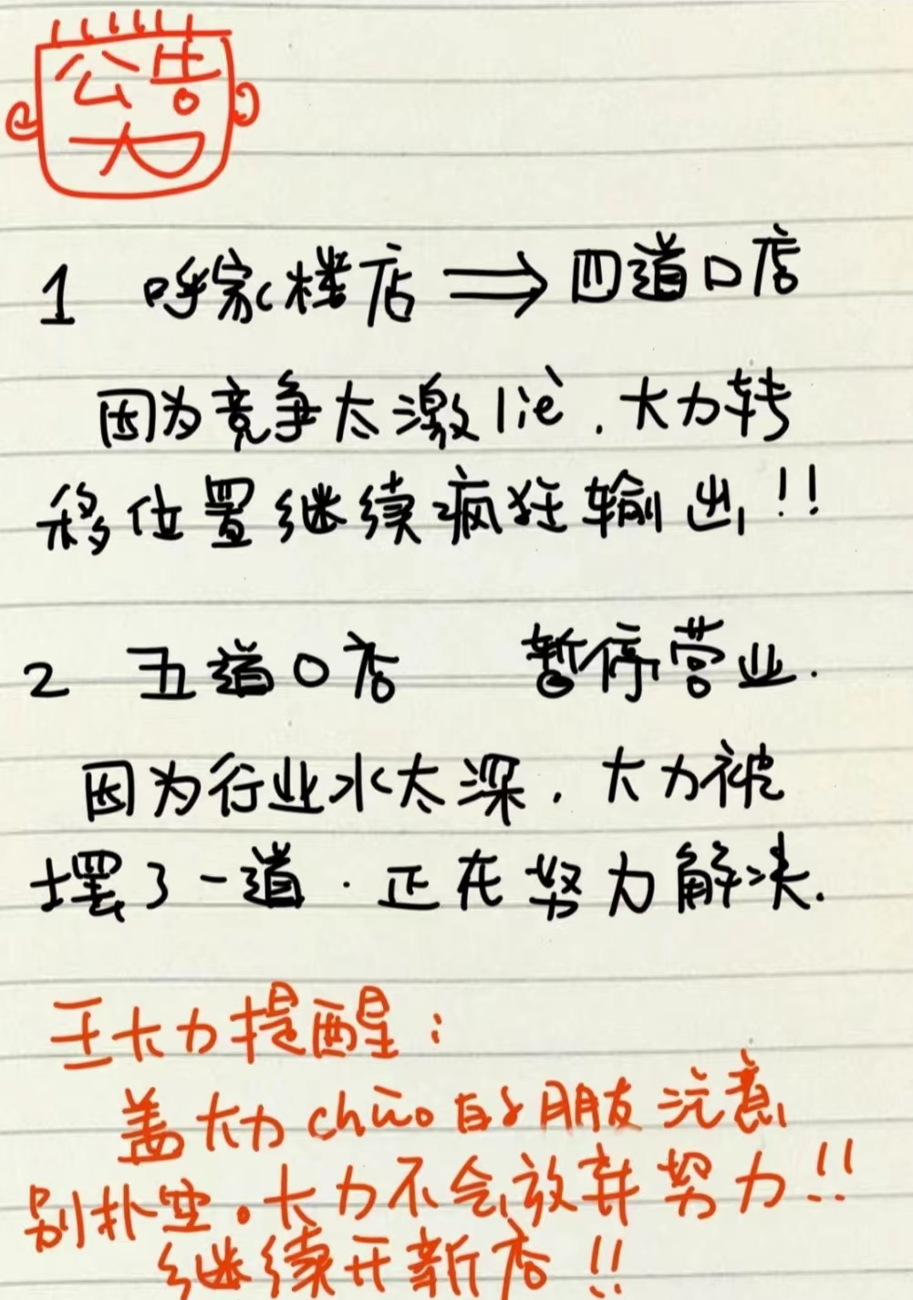 就在上周五(4月22日),王大力在小红书上发布了一则“移店”公告,同样是手写体,官宣将北京呼家楼的店搬到四道口。理由也很直接:竞争太激烈,选择转移位置继续疯狂输出。