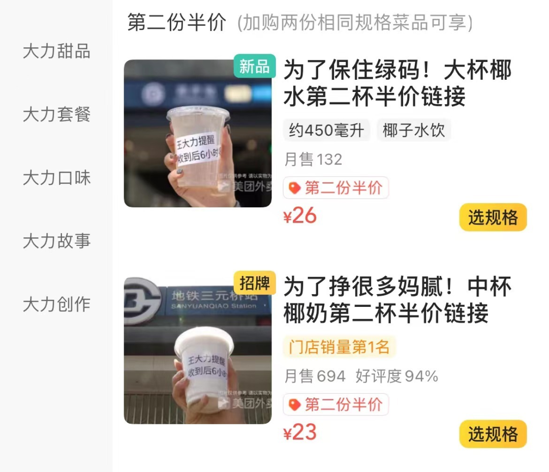 打开王大力椰奶的菜单,我发现,所有的产品都是椰子水、椰奶的相关延伸。这无形中减少品牌研发以及供应链端的压力。