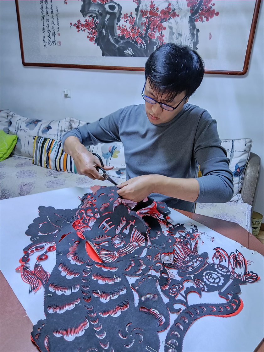 一把剪刀,一张桌子,一个板凳,就是郭现强的创作场地和工具。身高一米九,运动员出身的他做起剪纸来,手指灵活,手上蕴藏千秋,作品令人称奇。