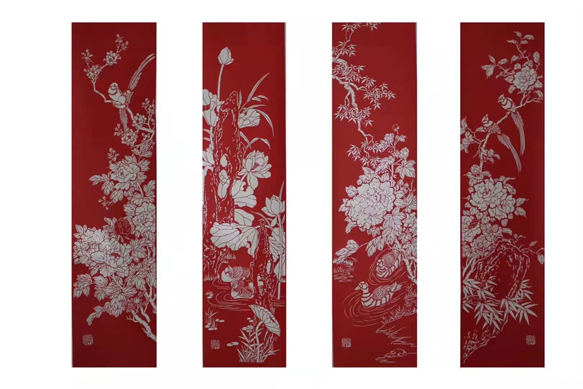 郭现强,自幼酷爱书画,起初以画山水花鸟为主,爱上剪纸艺术后,自2006年开始专心创作剪纸,后经多年努力把书画与剪纸相结合,汲取前人名家之所长,形成了自己独特的风格。精致生动的传统花鸟画,端庄抚琴的古代仕女人物,儒雅而有礼数的古代圣贤,刚劲有力的古代人物字画等,他的剪纸作品线条细腻,巧夺天工,刀剪如梭行流水,对于所剪人物和事物的细节把握到位,不仅打破了传统剪纸单一的红色,根据情景的需要,金色、蓝色、黑色等完美组合,相得益彰。在题材上,花鸟、人物、动物、书法等,从传统到现代,与时俱进,开启了剪纸的新篇章。