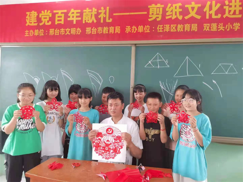 为传承和发扬非物质文化遗产,让文化遗产“活”起来,发现和培养新一代传承人,郭现强自2019年始走进石家庄市诸小学开展传统文化进校园之“小小非遗传承人”普及培训计划,在志愿者的协助下给学生们上非遗实践课,义务进行剪纸技艺普及,让他们近距离感受到非遗的魅力。活动使学生们在传统文化的教育与熏陶中,更好地理解和感知了“什么是文化自信”,为民族文化生生不息的传承积蓄了后备力量。