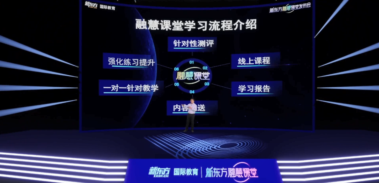 新东方国际教育培训事业部研发总监姚宇西介绍,融慧课堂的“融”体现在两个方面:学生和课堂的融合,线上与线下的融合。