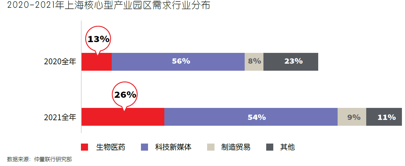 近年来,上海生命科学企业的租赁需求持续扩张,据仲量联行所追踪的核心型产业园区行业需求分布统计,生命科学企业的租赁需求在所有行业的占比中,从2020的13%攀升到2021年的26%,成为市场最主要的需求来源之一。