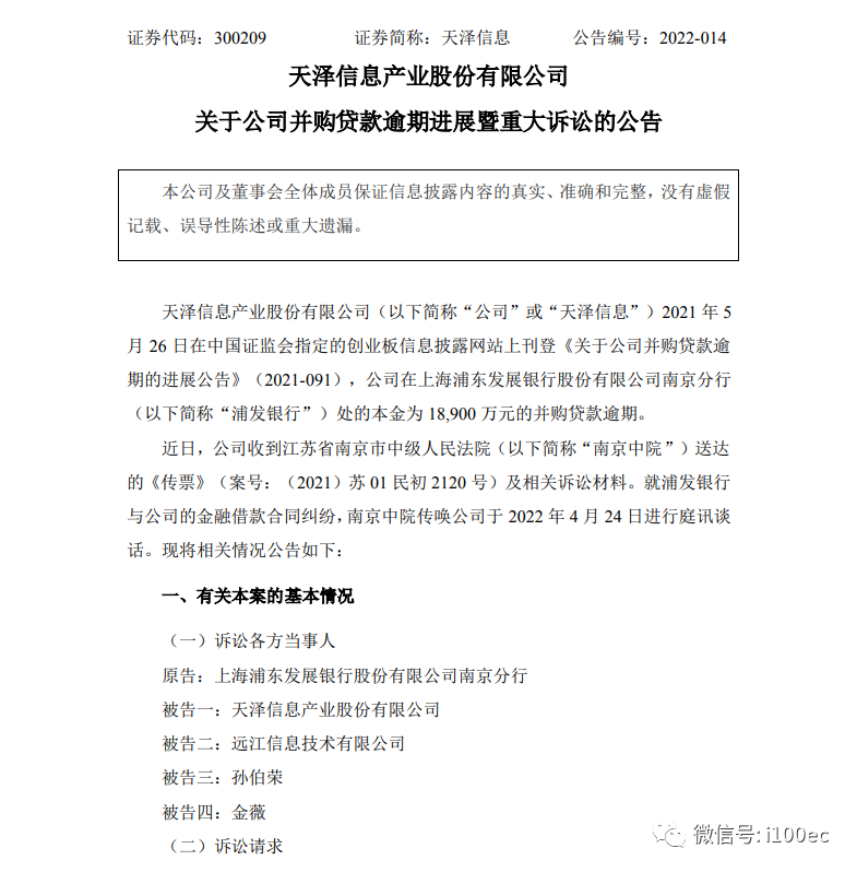 4月25日消息,日前,天泽信息收到法院传票,系在浦发银行南京分行的1.89亿元并购贷款逾期。