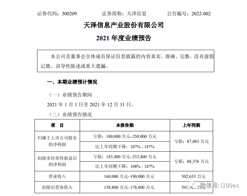 日前,天泽信息发布2021年业绩预告。报告显示,预计2021年净利亏损18亿元-25亿元,同比下降107-187%;扣除非经常性损益后的净利润亏损18.34亿元-25.34亿元,同比下降108%-187%。预计营业收入16亿元-19亿元,上年同期50.27亿元;预计扣除后营业收入15.9亿元-17.9亿元,上年同期50.18亿元。