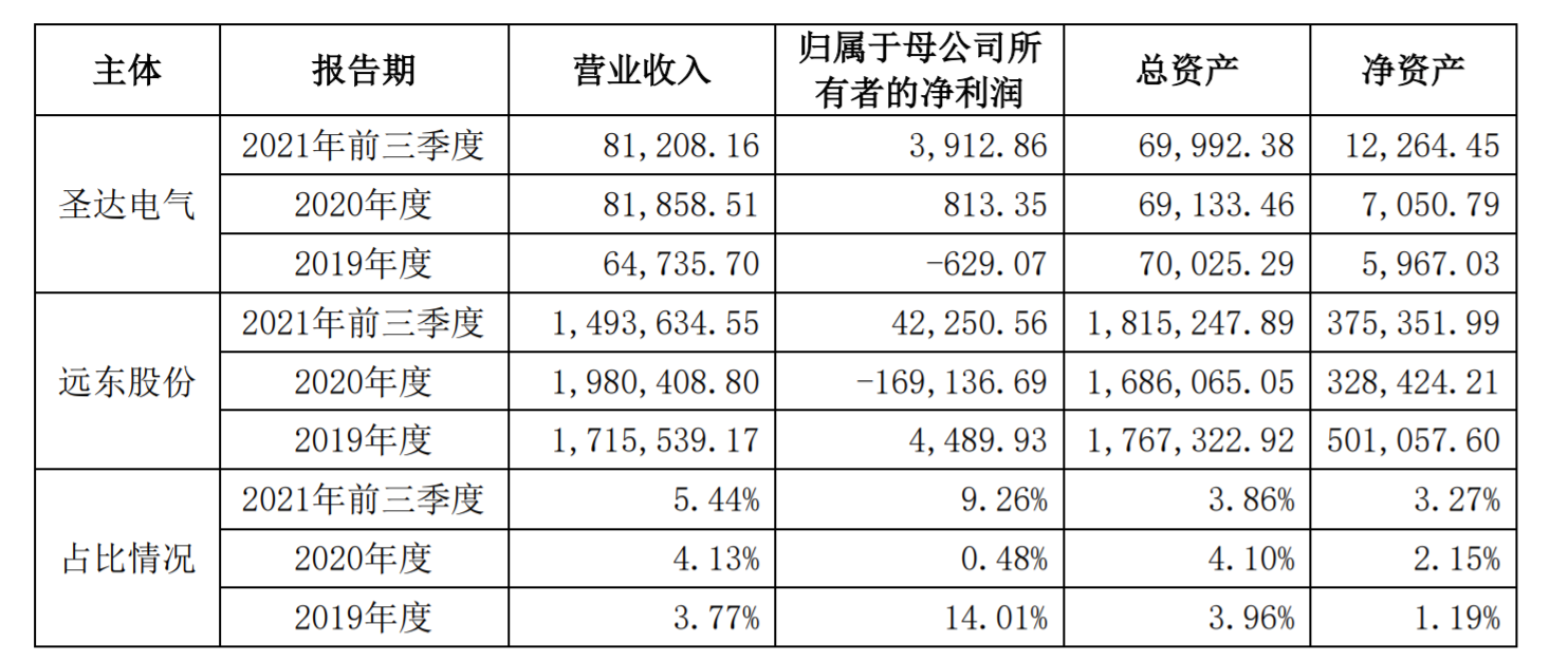 2020年和2021年前三季度,圣达电气营收占远东股份的比重分别为4.13%、5.44%,归母净利润占后者的比重分别为0.48%、9.26%。