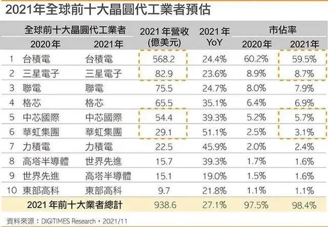 2021年全球前十大晶圆代工厂预估(图源:DIGITIMES Research)