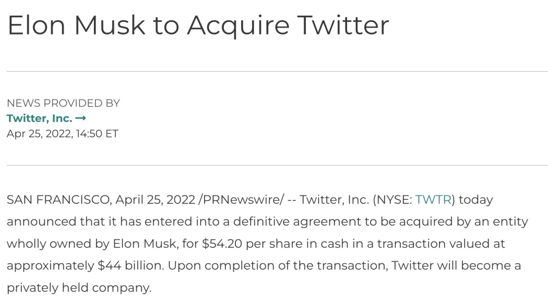 Twitter于4月25日宣布,董事会已经全票通过了马斯克的收购要约,公司将以每股54.2美元的价格(约合440亿美元,2880亿元人民币),全资出售给马斯克。