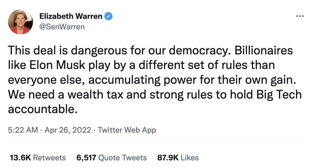 “这笔交易对民主造成危害,像马斯克这样的亿万富翁在一套不同的规则下进行着游戏,为自身利益谋权。我们需要征收财富税和强硬的规则,让大公司承担起责任。”美国民主党参议员伊丽莎白·沃伦表示。