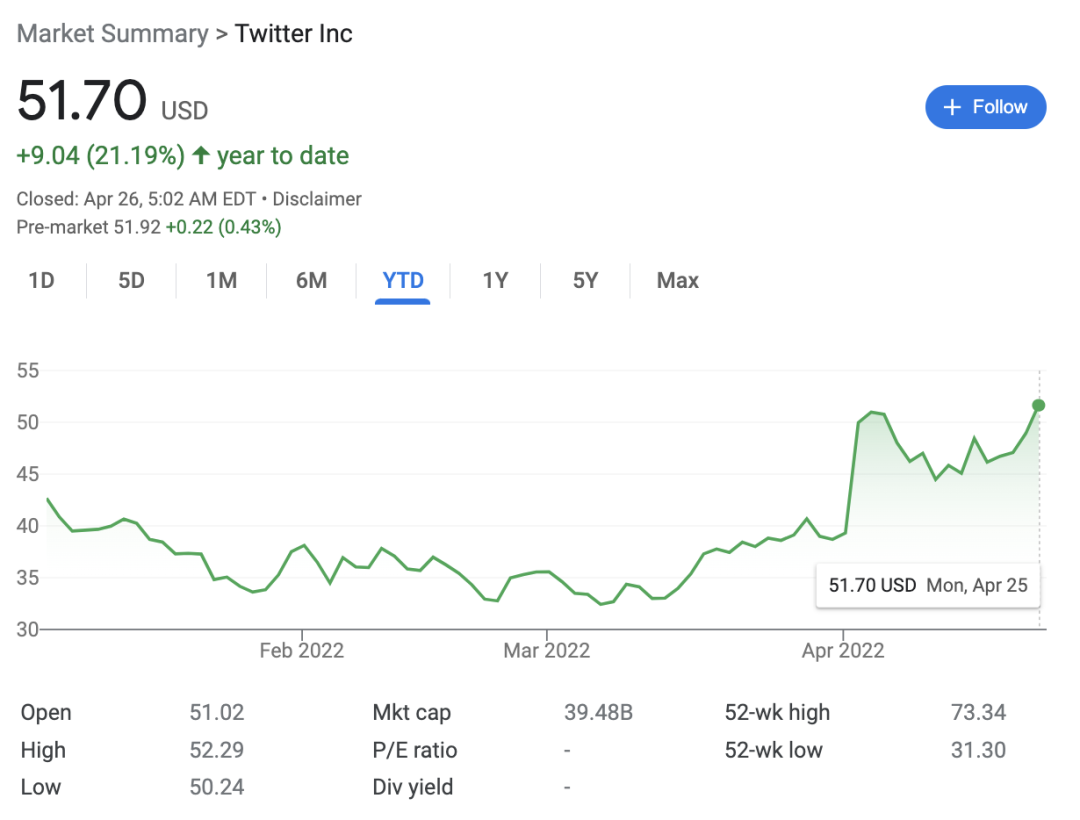 受收购消息影响,Twitter股价出现攀升,周一小幅上涨至51.7美元,今年以来上涨21.19%,在股市一直不太吃香的Twitter已经跑赢了其他科技股和大盘。Twitter定于周四公布Q1业绩,其表示周四当日将不再与分析师举行电话会议。