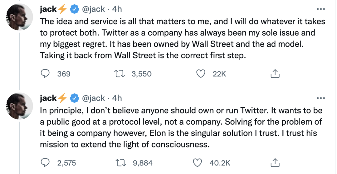 “作为一家公司,Twitter一直是我的一块心病,也是我最大的遗憾,因为它已经被华尔街和广告模式所束缚。如今,马斯克将它从华尔街手中收回,正是迈向正确方向的第一步。”Twitter联合创始人、前CEO、马斯克好友Jack Dorsey对此发推表明立场。