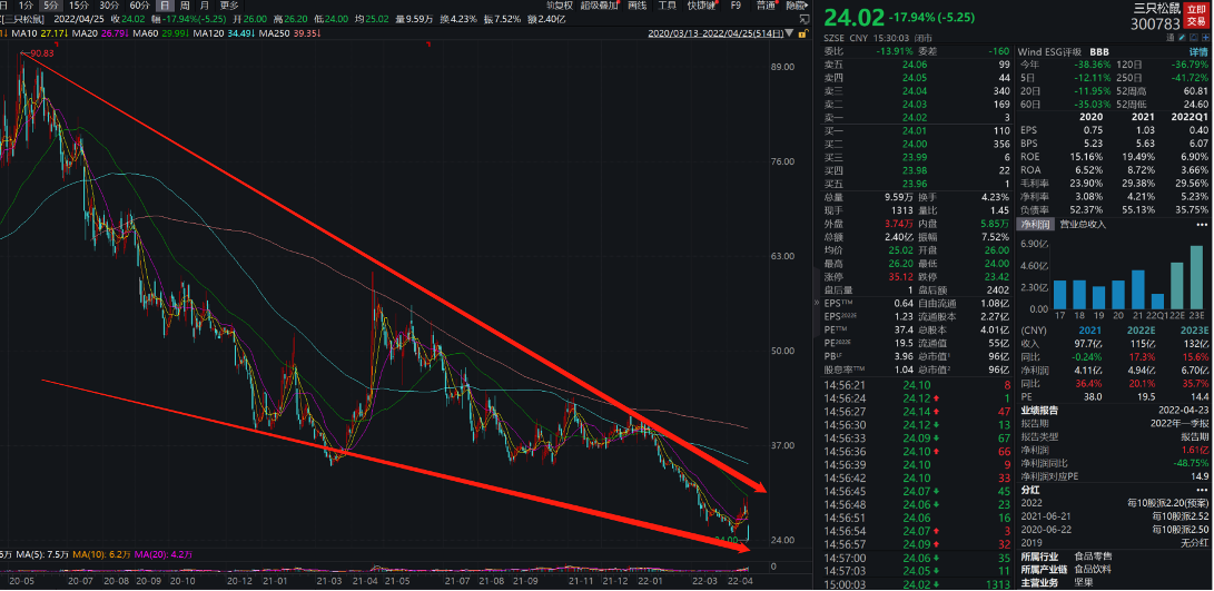 要知道,没什么能比亮眼的业绩更能打动投资者的心。反映在资本市场上,三只松鼠股价断崖式暴跌。财报发布后的4月25日、4月26日,三只松鼠接连两日大跌,其中4月25日收跌17.94%,4月26日收跌7.08%,两个交易日累计下跌23.74%。