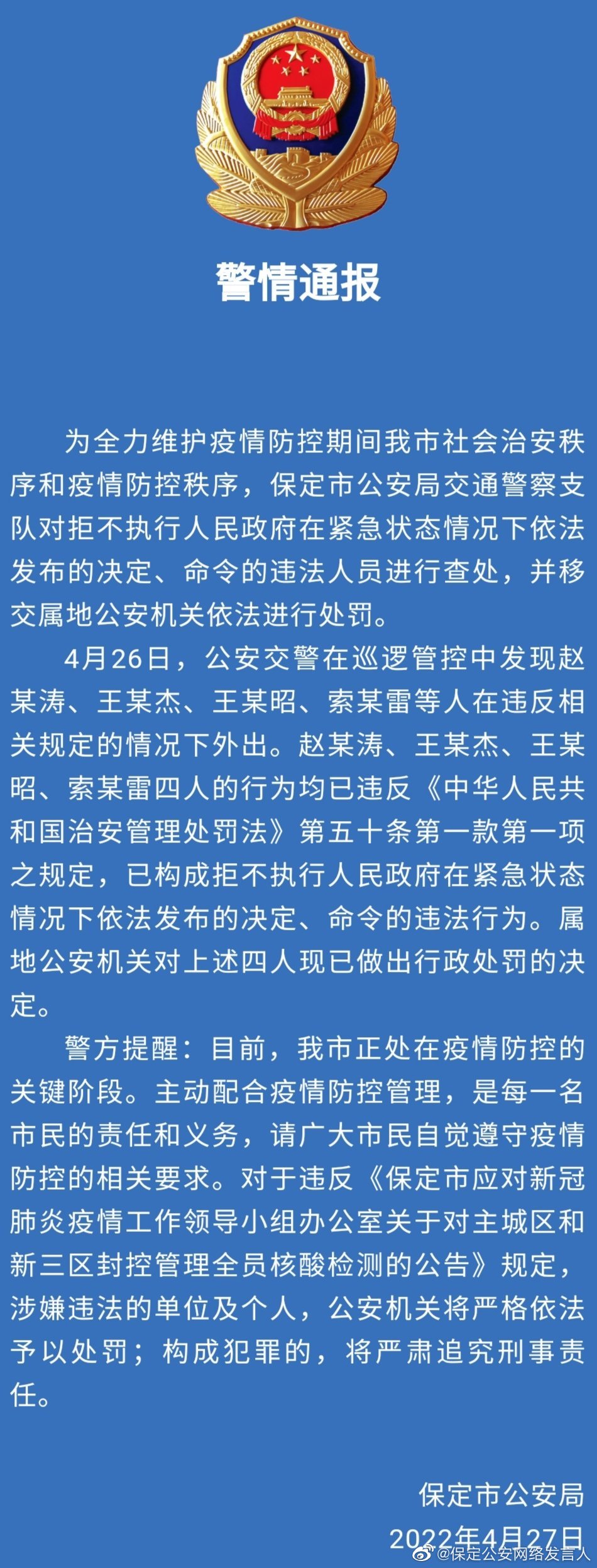 @保定公安网络发言人 微博27日通报,26日,公安交警在巡逻管控中发现4人在违反相关规定的情况下外出。属地公安机关对上述4人已做出行政处罚的决定。