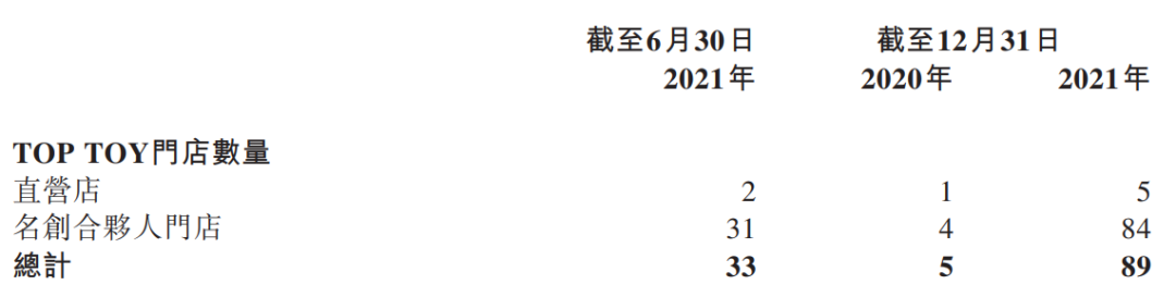 TOP TOY门店数量2021年末达到89家,包括13家梦工厂店和76家潮玩集合店,又可分为5家直营店与84家名创合伙人门店。