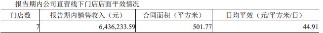 这7家门店,2021年共实现营业收入643.62万元,合同面积501.77平方米,日均平效为44.91元/平方米/日。