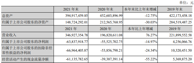 年报显示,金运激光2021年收入3.47亿元,同比增加76.27%;归属于上市公司股东的净利润为-6383.79万元,亏损同比扩大14.97%。