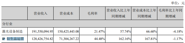 金运激光2021年分行业收入成本概况
