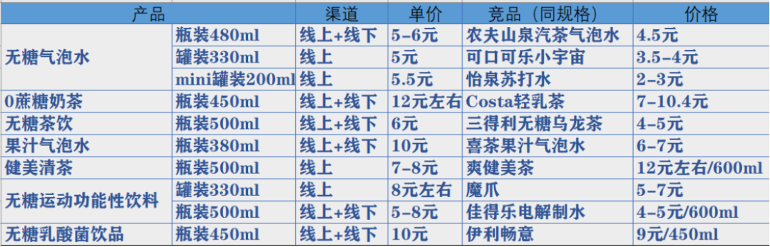 从官网上看,元气森林当下主打九个子品牌,相应产品类别为:气泡水、乳茶、乳酸菌饮料、功能性饮料、无糖茶饮、植物纤茶、矿泉水、巴旦木奶和酸奶。几乎每一款都能在市面上找到对标,气泡水、无糖茶饮的价格区间在5-6元,其他类别饮品均价在10元左右,同品类比之下,元气森林的价格普遍比竞争对手高了至少0.5元,