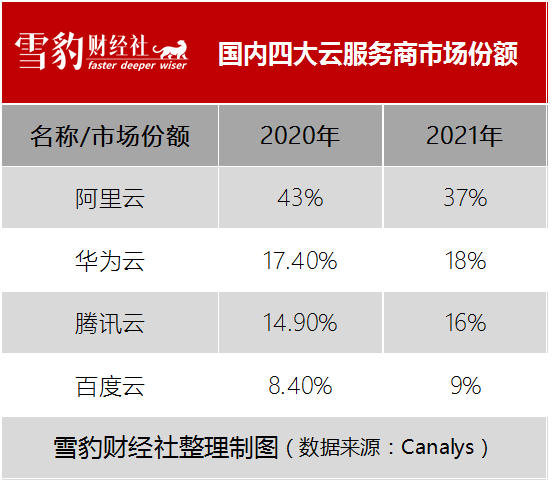 Canalys在3月21日发布的数据显示,2021年,阿里云虽然在国内云服务商中仍排名第一,但市场份额已从40.3%下滑至37%。相比之下,华为云、腾讯云和百度云的市场份额都获得了提升。